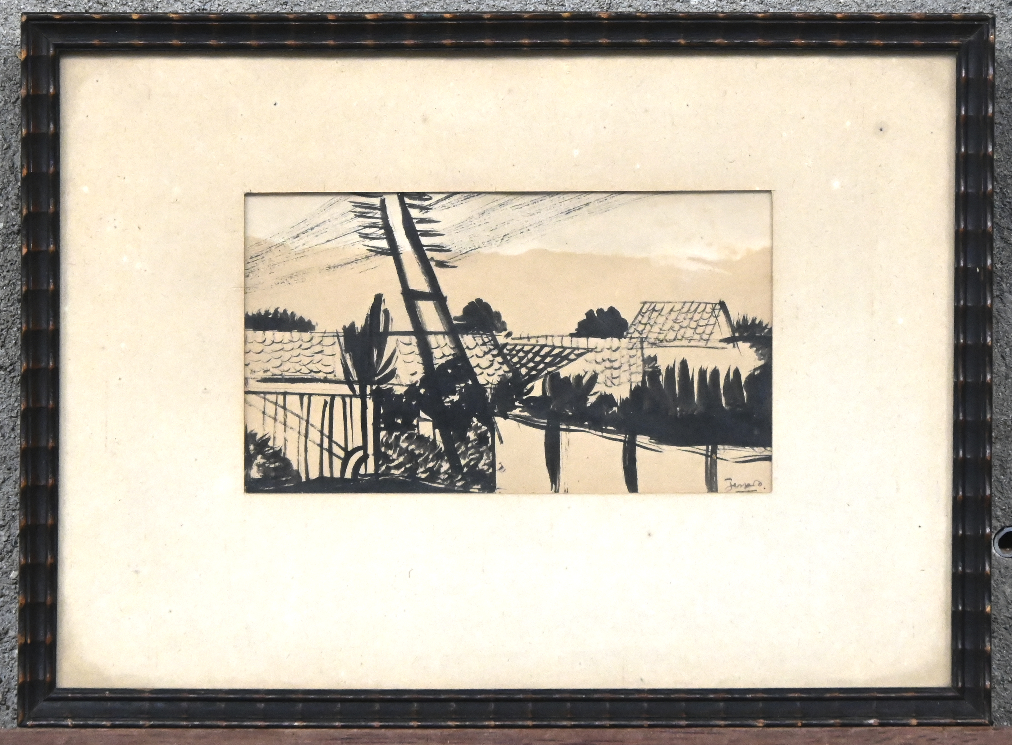 "View of brickworks", a drawing, Chinese ink on paper, signed Jespers.