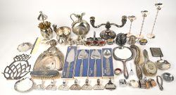 #112Een groot lot van verzilverde en tinnen tafelversiering, kandelaars en make-up set.