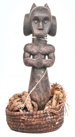 #383BamounEen voorouderbeeld van gebeeldhouwd hout in een touwen mandje.