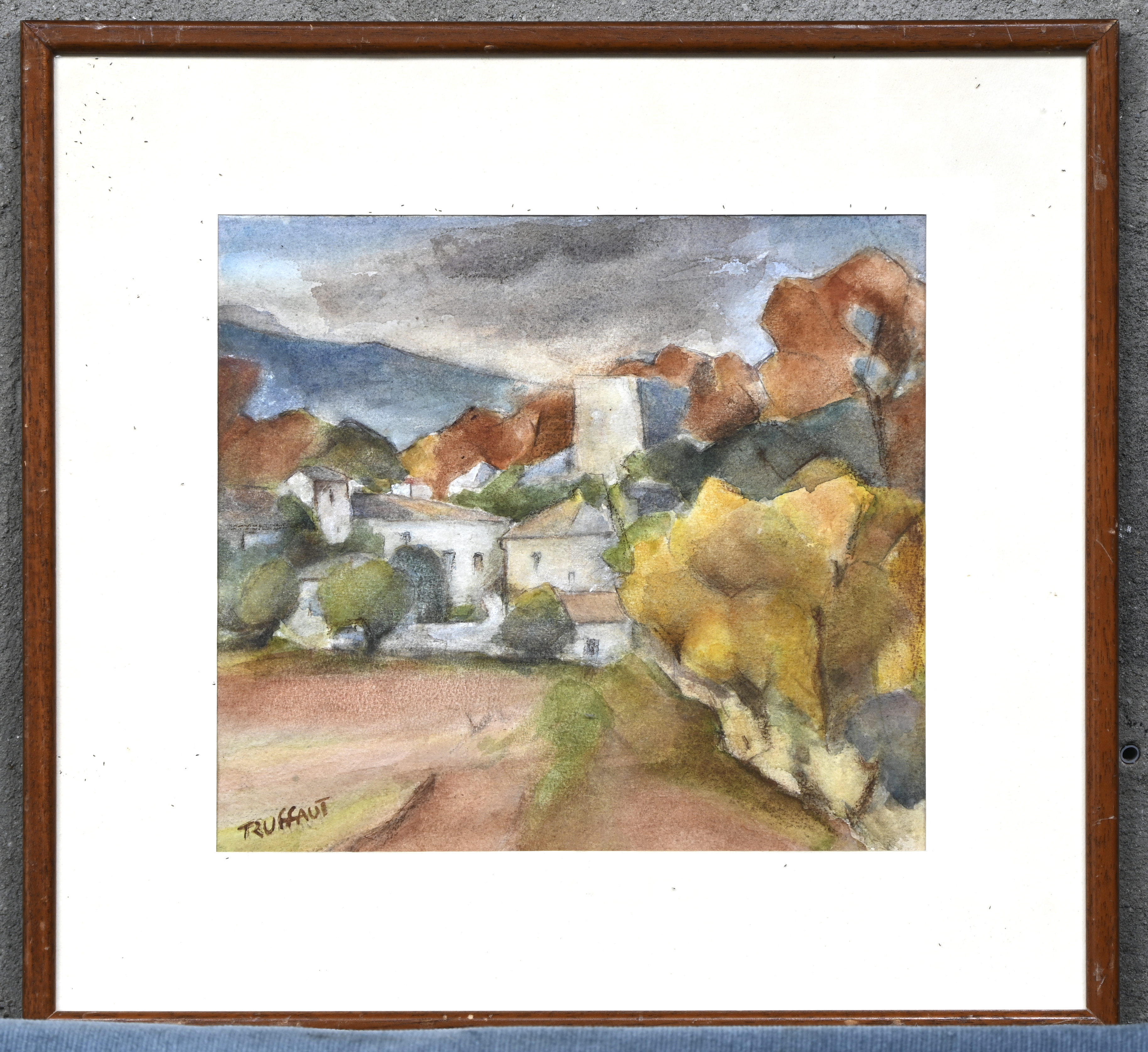 ‘Herfstlandschap’, een aquarel. Getekend; M. Dethy.