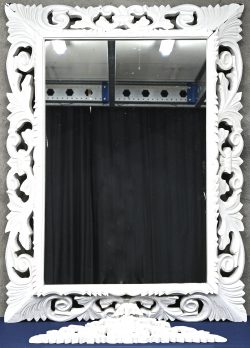 #206Een wit geschilderde hallspiegel in een massief gesculpteerde houten lijst, met bijbehorend sierelement.