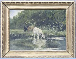 ‘Cows by the Water’. Verdoekt oil painting. Presumably 19th century. Indecipherable signature in the bottom left corner. -