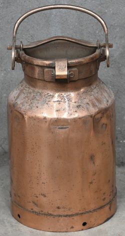 An old copper milk churn, dented.