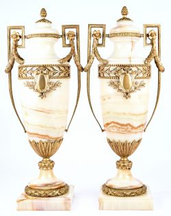 A pair of alabaster cassolettes with bronze garlands.No longer availableDim. Hoogte 59 cmEstimate: € 300 / 500 -