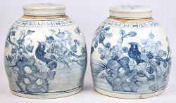 A pair of blue and white Chinese porcelain ginger jars with lid, floral decoration featuring birds.No longer availableDim. h 29 cm, Ø 28 cmEstimate: € 80 / 120 -