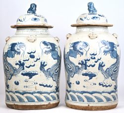 #403Een paar blauw-witte Chinees porseleinen dekselpotten, met drakendecor.