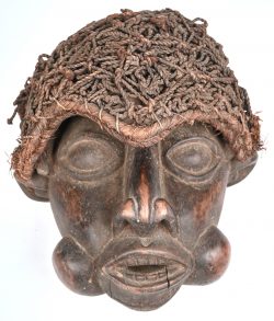 #428Een groot masker van gebeeldhouwd hout met baard en haar van geknoopt touw. Kameroen.