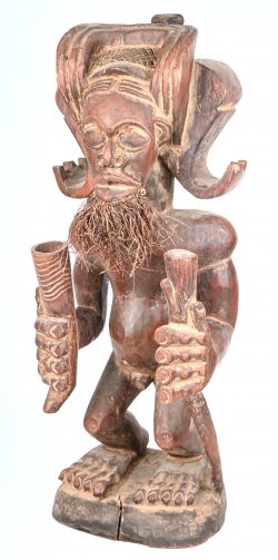 An ancestral figure carved in wood of a bearded man holding a staff and a horn.No longer availableDim. H. 62 cmEstimate: € 80 / 120 -