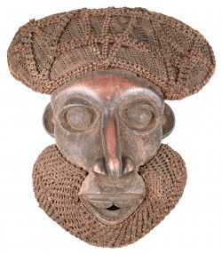 #488Period: 1868-1930Een masker van gesculpteerd hout met hoofddeksel van touw. Kameroen.