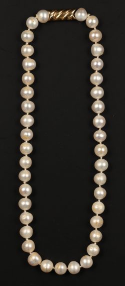 #65Een parelhalssnoer met 18 kt geelgouden slot.