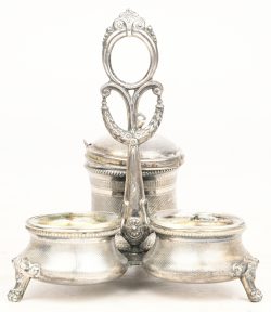 A spice set of silver and crystal. Salt and pepper shakers and a mustard pot with spoon. Crystal inner containers. Guilloché decoration.No longer availableDim. 130 gEstimate: € 100 / 120 -