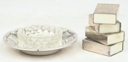 A silver and crystal salt cellar, along with four silver match holders with a lined motif.No longer availableDim. 95 gEstimate: € 80 / 120 -