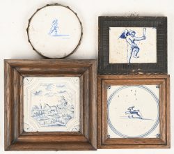 Four assorted framed Delft tiles. An angel (8 x 11 cm), a child with stick (Ø 12.5 cm), a landscape with a horse cart (12.5 x 13 cm), a running hare (12 x 12 cm). 17th century and later.No longer availableDim.Estimate: € 100 / 120 -
