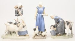 Three figurines of multicolored porcelain. One depicting a girl with chickens (H. 24 cm), one with a cow (H. 16 cm), and one with a goat (H. 24 cm). Marked at the bottom.No longer availableEstimate: € 120 / 140 -