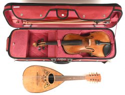 #508Een oude viool in koffer, met twee strijkstokken en een stemkastje. Toegevoegd een oude mandoline.