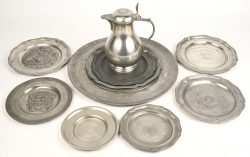 A lot of 10 pewter plates/dishes and a pitcher. 6630 grams.No longer availableDim. Ø 38 cmEstimate: € 60 / 80 -