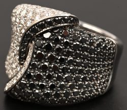 #230Een 18 kt witgouden ring bezet met witte briljanten met een gezamenlijk gewicht van +- 1,90 ct. GSI 1 en zwarte diamanten met een gezamenlijk gewicht van +- 2,26 ct. Met certificaat.
