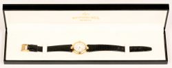 #580Een 18 kt electroplated dameshorloge met lederen polsband. Met certificaat en originele doos.