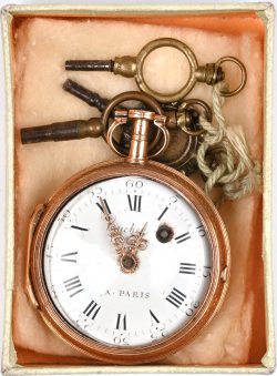 #240Een 18 kt geelgouden zakhorloge met een jachttafereel aan de achterkant. Met sleuteltjes.
