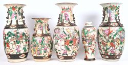#483Een lot van vijf Nanking vazen waarvan één met haarlijnscheur en een paar met schilfertjes.