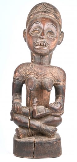 Wooden statue of a crouching Pfemba mother with child. Adorned with tattoos, nsunga on the arms, and wearing a mpu on the head.No longer availableDim. H. 62 cmEstimate: € 200 / 300 -