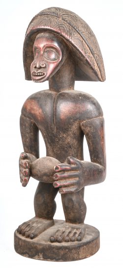 Wooden statue of a standing figure with a large headdress and an oval object in its hands.No longer availableDim. H. 60 cmEstimate: € 80 / 120 -