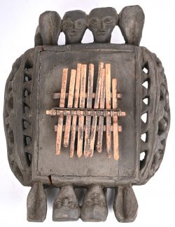 #429Een Sanza muziekinstrument van hout met bamboe. Rijkelijk gebeeldhouwd hout. Kameroen.