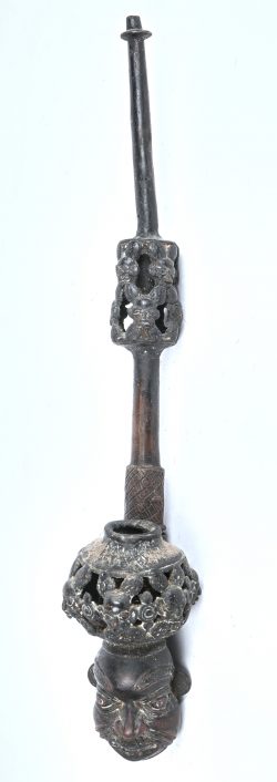 #459Een bronzen ceremoniële pijp versierd met ajourgewerkte menselijke figuren. Onderaan een mannenhoofd. Kameroen.