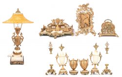 #133Een bureaugarnituur van goudkleurig metaal en onyx. Bestaande uit een inkstel versierd met een Napoleonbeeldje, een paar penhouders, een paar kandelaars, een paar cassolettes, een brievenhouder, een briefopener, een schemerlamp, een fotolijst. Directoire stijl, medio XXste eeuw.
