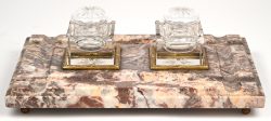 #598Een inktstel met twee vierkante kristallen inktpotten (één met schade aan een hoek) op een gevlamd marmeren basis. Messingen bolpootjes.