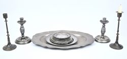 A collection of pewter items including four candlesticks, a bowl, and plates. With a total weight of 4.8 kg.Dim. 4,8 kgEstimate: € 40 / 60 -