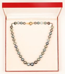 A “Tahiti” pearl necklace in different colors of gray and brown and with an 18 carat yellow gold clasp.No longer availableDim. 39 x 30cmEstimate: € 75 / 150 -
