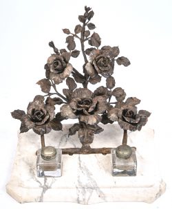 #61Een inktstel met smeedijzeren rozentak in de stijl van Van Boeckel. Op een witte marmeren voet, met twee inktpotten.