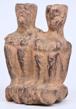 #8Een terra cotta beeld van twee zittende figuren. Onbekende herkomst.