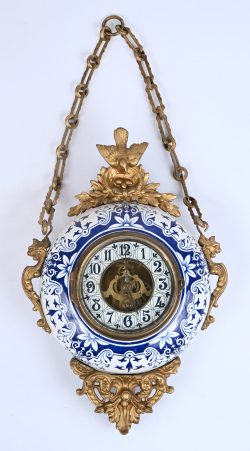 An openworked round clock, Delft blue pottery with gilded zamak. Crack in the dial.Dim. h 38 x Ø 21 cmEstimate: € 40 / 60 -
