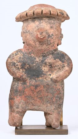#367Een aardewerken beeldje van een staande vrouw met hoofdtooi. Met resten van polychrome beschildering, in precolumbiaanse stijl.