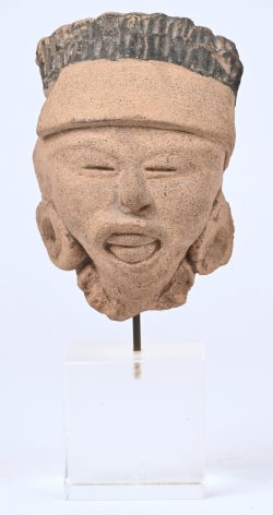 “Head of a man with feather headdress.” A terracotta figurine in pre-Columbian style with black decoration.Dim. Hoogte 12 cmEstimate: € 80 / 120 -