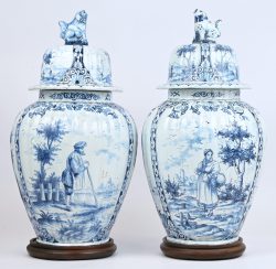 #253Een paar blauw en witte dekselvazen van Delfts aardewerk. Beide hebben een schilfer. Onderaan gemerkt AK. Met houten sokkel.