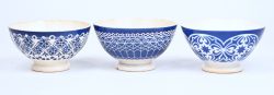 Three small bowls of blue and white glazed earthenware. One is marked Sarregueminnes.Dim. Hoogte 8, Ø 15 cmEstimate: € 30 / 50 -