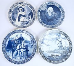 Four large decorative plates of blue-and-white glazed earthenware.Dim. Ø 33 en 39 cmEstimate: € 40 / 60 -