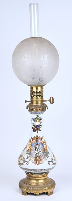 #257Een olielamp, messing, aardewerk en glas, vermoedelijk Gien.
