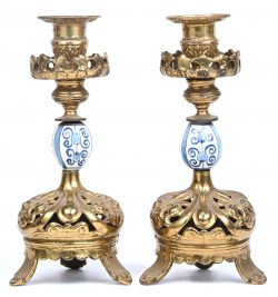 #108Een set van 2 kandelaars, messing en blauw-wit aardewerk.