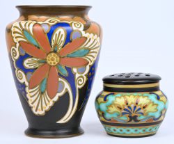 #23Een lot van 2 meerkleurig Gouda aardewerk bestaande uit een vaas gemerkt Princess met monogram van de maker en een pique-fleur met haarlijn en schilfer gemerkt Schoonhoven.