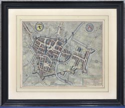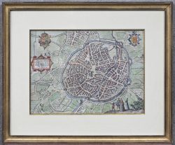 #245‘Stadsplan van Mechelen’, een ingekleurde antieke gravure. Met centrale vouw, 17e eeuw.