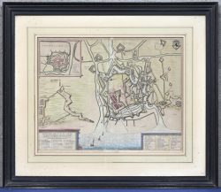 #202Beleg van Oostende, een ingekleurde antieke stadskaart van de verdedigings- en aanvalslinies rondom de stad en in het omliggende gebied. Links het kwartier van Spinola, rechts het kwartier van aartshertog Albrecht. Onderaan twee cartouches met de titel en de legenda's A-R en 1-34. Linksboven een inzet met een plattegrond van de stad in 1641.