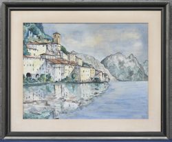 #574‘Bergdorp aan het water’, een aquarel. Getekend M. Coopman.