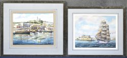 #215‘Een driemaster onder zeil’ & ‘Vissersloepen in de haven’, twee aquarelen. Getekend en gedateerd.