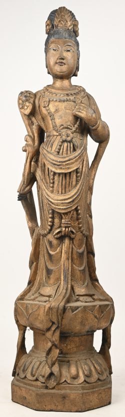 A polychrome carved wooden Guanyin statue.Dim. h 69 cmEstimate: € 80 / 120 -