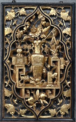 #362Een Chinees snijwerkpaneel met een decor van vazer en florale motieven.
