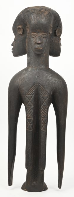 #514Een driehoofdig beeld van gebeeldhouwd hout. Mannelijk en vrouwelijk. Hemba, Kongo.